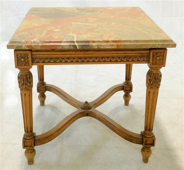 Tavolino basso di forma quadrata con gambe tornite, scanalate ed intagliate riunite da traverse sagomate, piano in marmo (cm 44x43x44) (difetti)