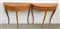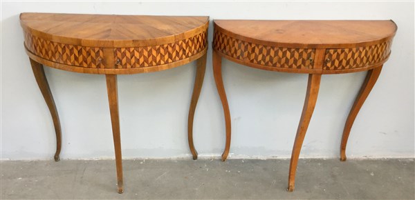 Coppia di consolles demilune lastronate, fronte a due cassetti decorati a motivi geometrici. Gambe mosse (cm 74x71x29) (mancanze)