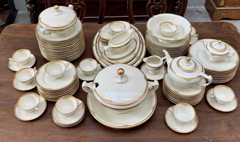Manifattura di Bavaria, parte di servizio in ceramica color crema profilata in oro, composto da: due zuppiere, cinque piatti da portata, una salsiera, una teiera, una lattiera, una zuccheriera, undici tazzine e numerosi piatti di diversa misura (difetti e mancanze)