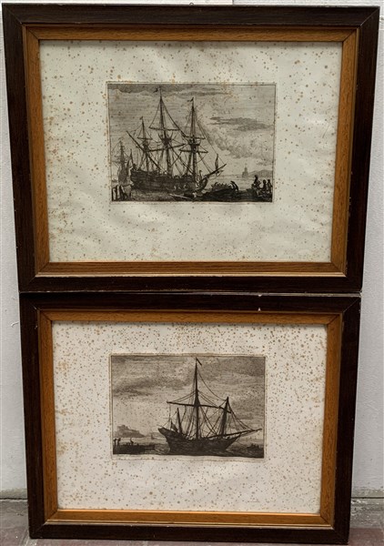Manglard "Scene portuali" coppia di acqueforti del secolo XVIII (cm 22x31) In cornici (difetti)