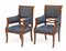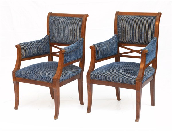 Coppia di poltrone con montanti sagomati, gambe a sciabola. Secolo XIX. Rivestite in velluto blu (difetti)