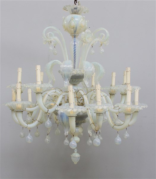 Manifattura di Murano secolo XX, lampadario in vetro opalescente (h cm 100) a sedici luci decorato con fiori ,foglie e pendagli (difetti e mancanze)