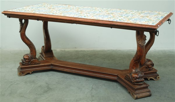 Tavolo rettangolare con gambe in legno scolpito a figure di tritoni riuniti da traversa piatta. Piano decorato da trentasei piastrelle in maiolica policroma (cm 186x82x85) (difetti)