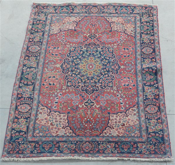 Tappeto persiano, secolo XX. Decoro con medaglione blu su fondo rosso. (cm 191x