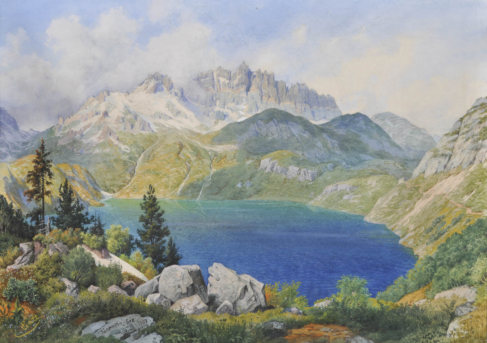 Ferdinand Gatt (Innsbruck 1847 – Brixen/Bressanone 1909) Lago Formarinsee presso Lech sull‘ Arlberg, 1907;Acquerello, 42,3 x 56,6 cm, montato su cartone,