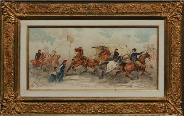 Lotto 880 | De Albertis "Scena con figure e cavalli" acquerello su carta (cm 26x51)