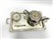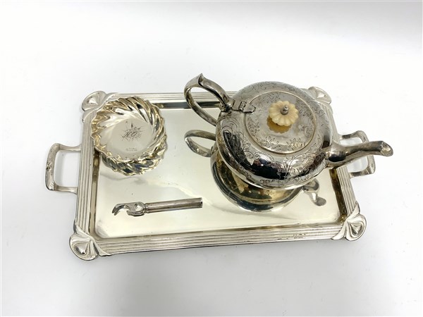 Lotto composto da un vassoio biansato a corpo liscio con bordura e anse scanalate unito a una teiera incisa a decoro floreale, una ciotolina e un cavatappi in metallo argentato (difetti)