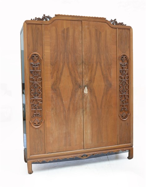 Armadio a due ante lastronate, montanti e fasce intagliati a motivi vegetali, fianchi a specchio, cimasa sagomata e intagliata (cm 162x217x57) (difetti)