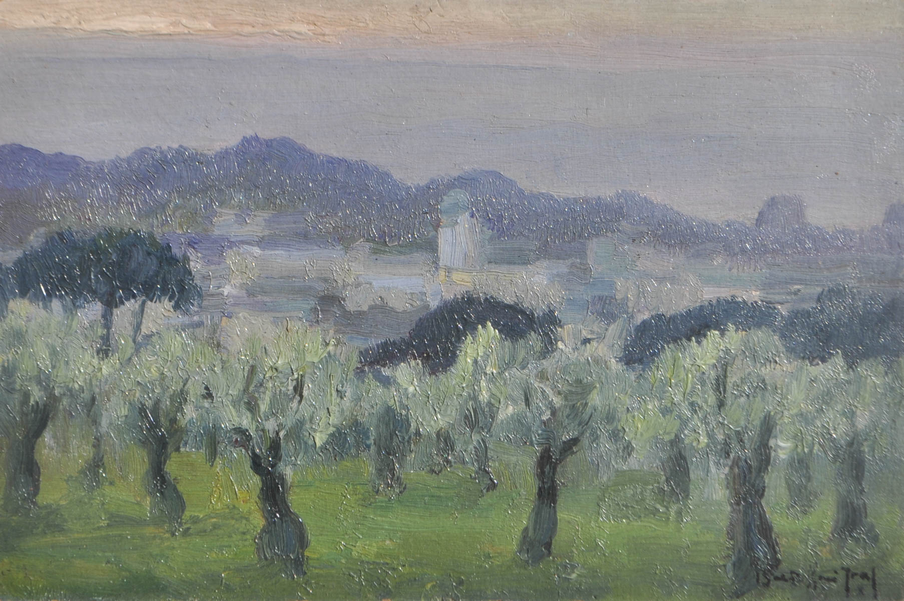Roberto Iras Baldessari (Innsbruck 1894 – Rom/Roma 1965) Oliveto sul Garda, 1935 ca.;Olio su tavola, 14,5 x 22 cm, in cornice