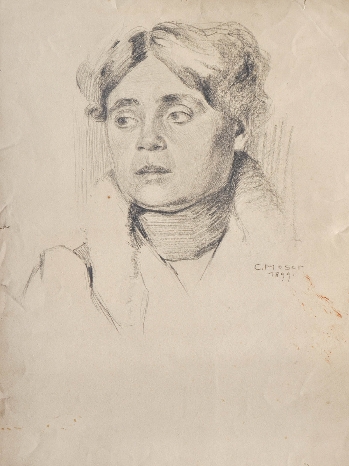 Carl Moser (Bozen/Bolzano 1873 – 1939) Ritratto femminile, 1899;Gessetti neri, 44,8 x 29,4 cm, strappo laterale