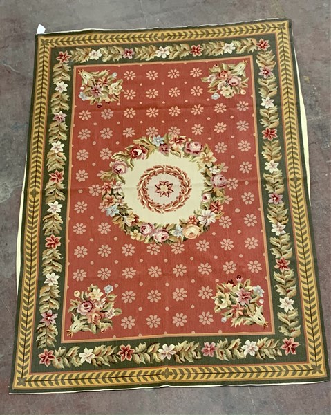 Tappeto piccolo punto di moderna manifattura. Decoro con stile Aubusson con medaglione floreale verde su fondo bordeaux cosparso di fiorellini e con angolari a bouquet. (226x155) (lievi difetti)