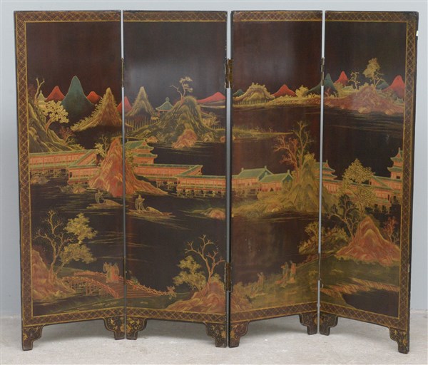 Paravento a quattro ante in lacca decorato in policromia e dorato sul fronte a