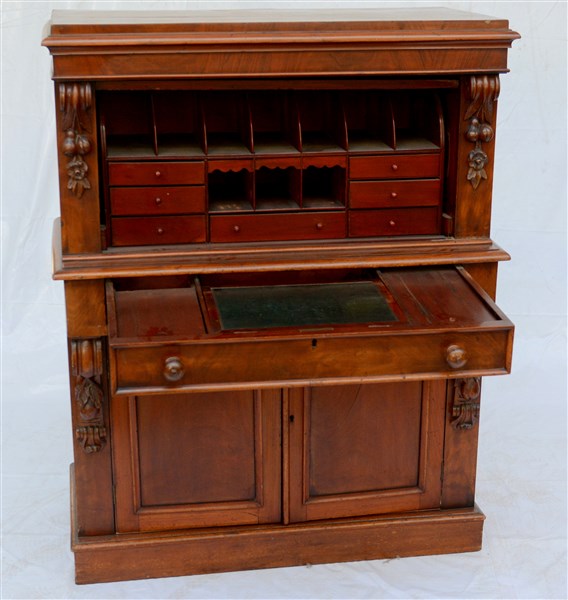 Secretaire con montanti scolpiti a volute, motivi vegetali e frutti. Due ante nella parte inferiore. Apertura meccanica collegata al cassetto. Scarabattolo a vani e cassettini, piano con leggio in pelle impressa in oro e vani laterali. Inghilterra, sec XIX (cm 111x141x60) (difetti e mancanze)