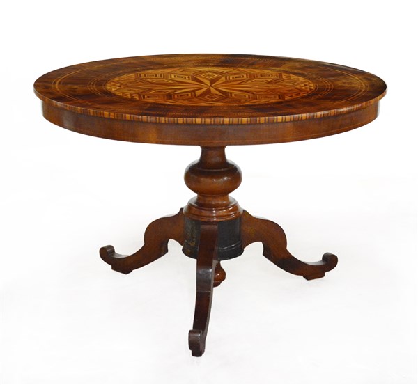 Tavolo con piano tondo intarsiato in legni vari a rosone e rombi concentrici, filettato in legno chiaro. gamba centrale tornita e parzialmente ebanizzata terminante a tre piedi sagomati (d cm 115x h cm 78) (difetti e restauri)