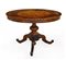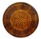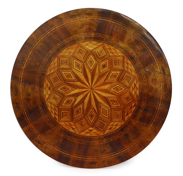Tavolo con piano tondo intarsiato in legni vari a rosone e rombi concentrici, f