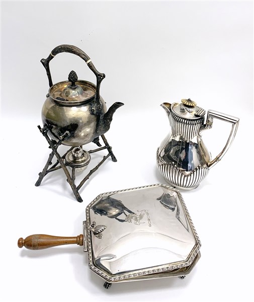 Lotto composto da un raccoglibriciole, una teiera e un samovar in metallo argentato