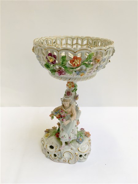 Manifattura di Dresda. Centrotavola in porcellana decorata in policromia a rilievo a fiori e a figura di fioraia a tutto tondo sormontata da vaso traforato (h. cm 28) (difetti)
