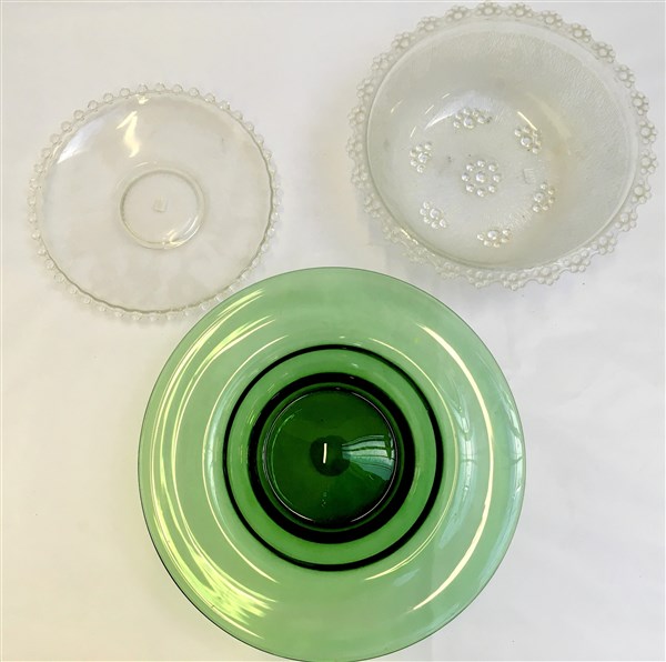 Manifatture diverse, lotto composto da un piatto verde ed un'insalatiera con piatto incolore, misure diverse