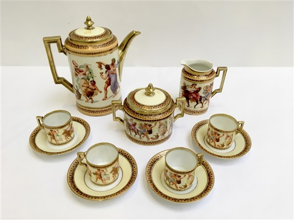 Manifattura di Thomas. Servizio da caffè in porcellana decorata in policromia e dorature a baccanali. Composto da caffettiera, zuccheriera, lattiera e quattro tazze con piattino (difetti)