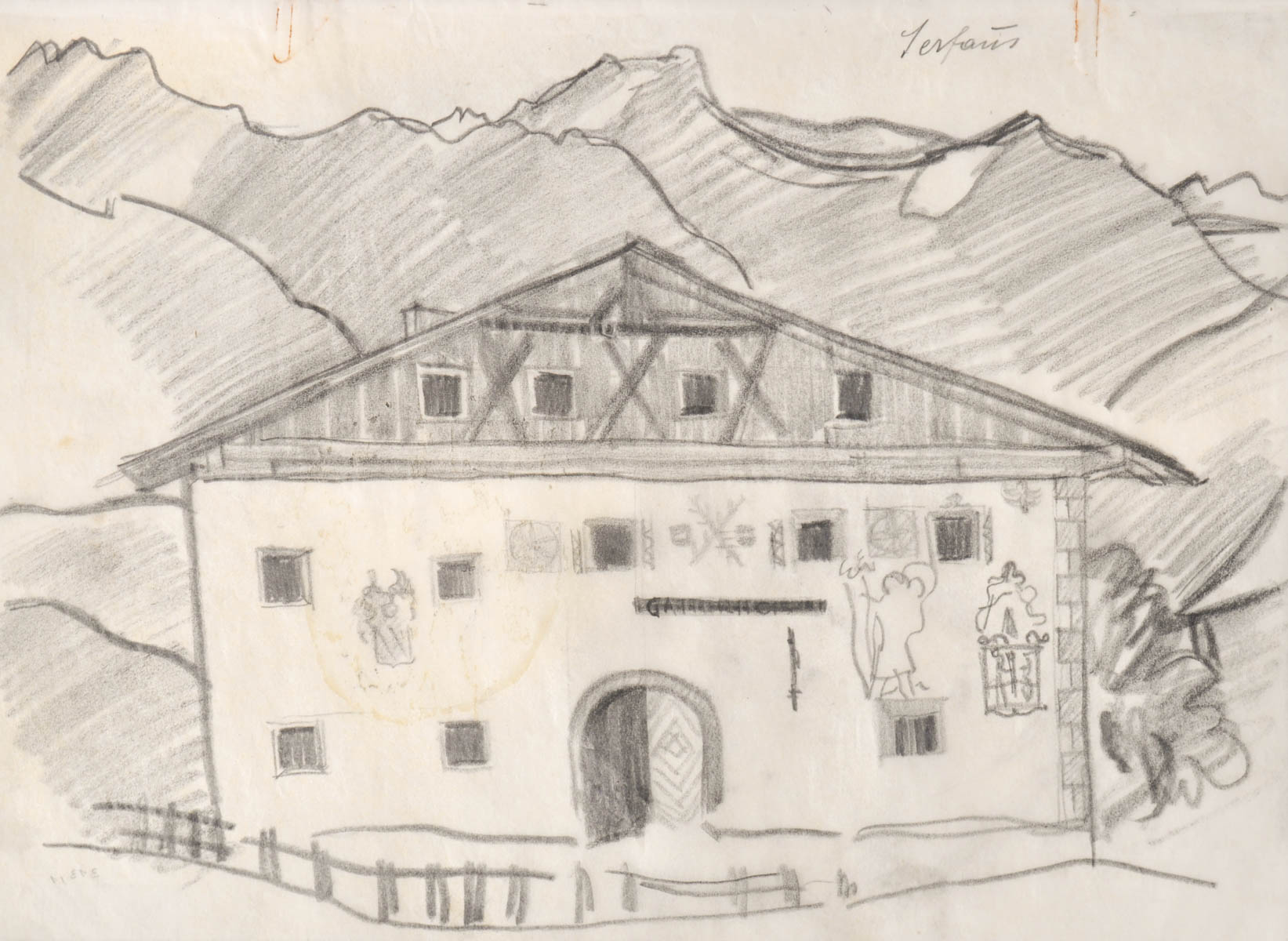 Erich Torggler (Kufstein 1899 – Innsbruck 1938) Casa rustica a Serfaus;Gessetti neri su carta lucida, 28,7 x 39,5 cm