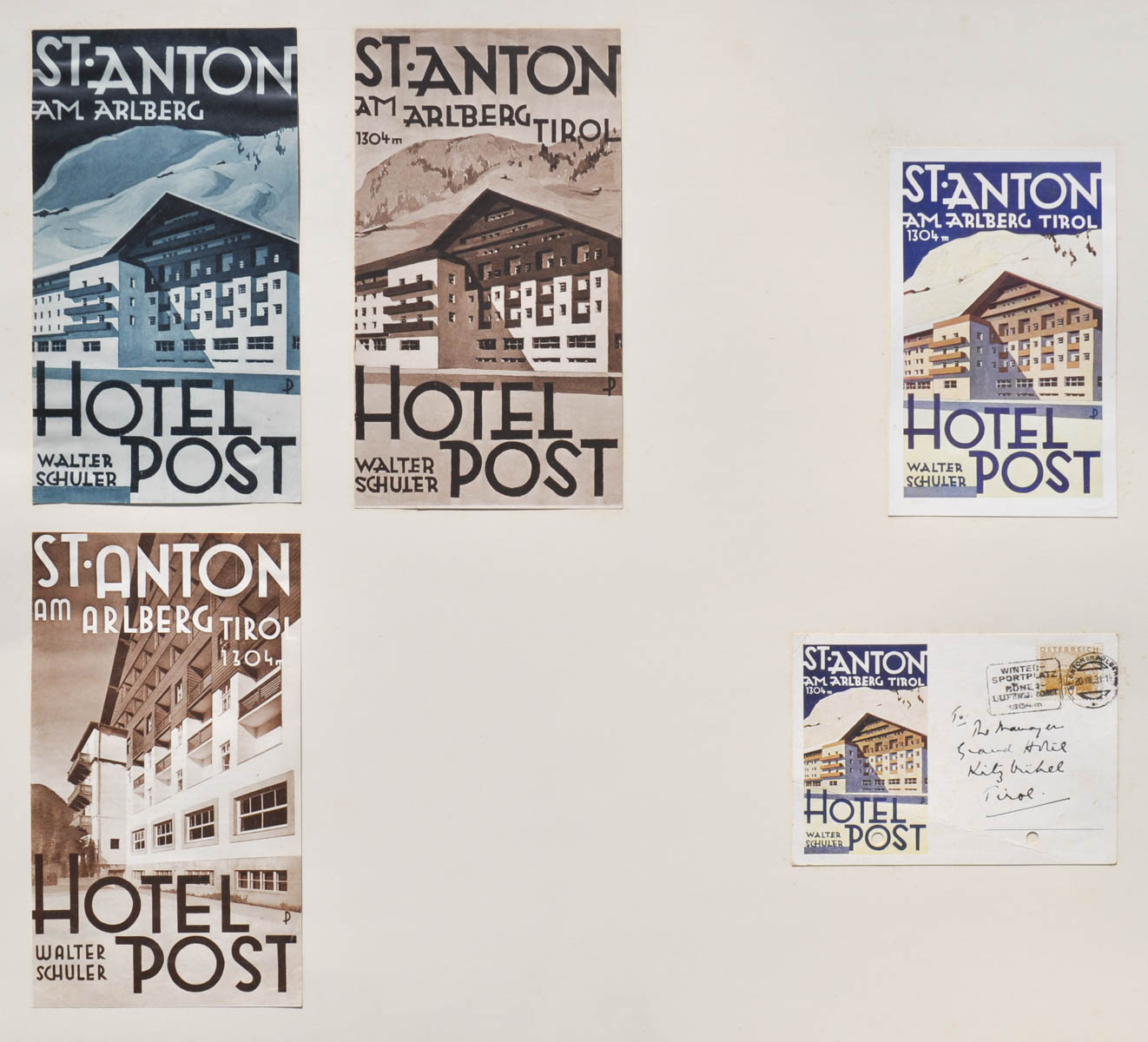 Wilhelm Nicolaus Prachensky (Innsbruck 1898 – Innsbruck 1956) St. Anton am Arlberg Tirol Hotel Post, 1931;4 stape, 21,5 x 12 cm o. 16,5 x 10,2 cm