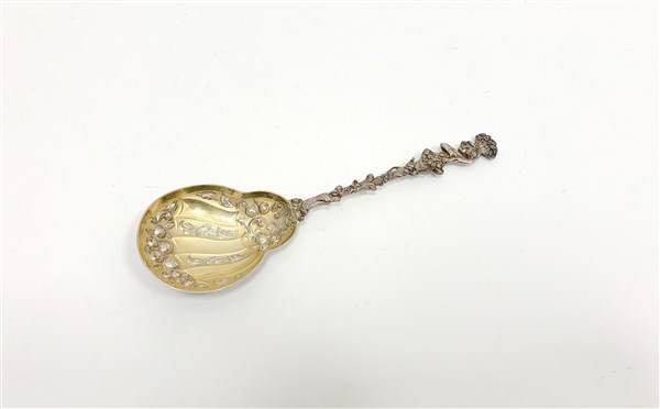 Cucchiaio in argento e vermeille sbalzato a frutti e motivi vegetali. Manico decorato a putto, fiori e volute. Inghilterra, secolo XIX (l. cm 21) (g 78)