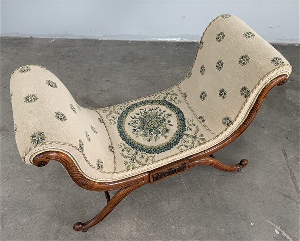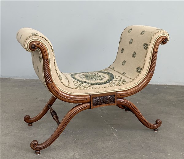 Panchetto in legno intagliato con braccioli estroflessi, gambe mosse terminanti a ricciolo e riunite da traversa (l. cm 102)