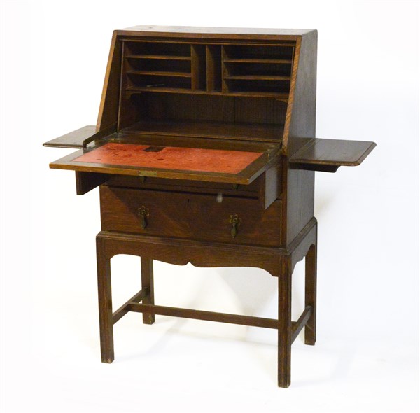 Ribaltina a due cassetti, antina celante vani a giorno, due pianetti laterali apribili, gambe e traverse dritte. Inghilterra secolo XIX (cm 61x107x38) (difetti)