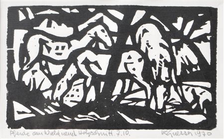 Karl Grasser (*Kortsch/Corces 1924) Cavalli ai margini del bosco, 1970;Xilografia, 11,5 x 19,5 cm (immagine), in cornice