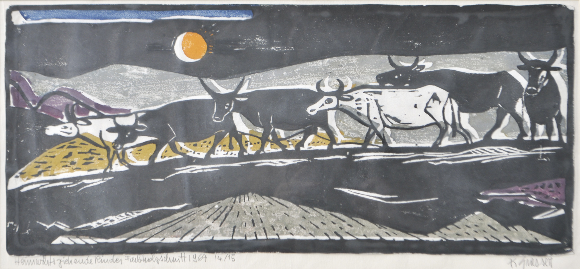 Karl Grasser Bovini che tornano a casa, 1974;Xilografia a colori, 21 x 47,5 cm (foglio), in cornice