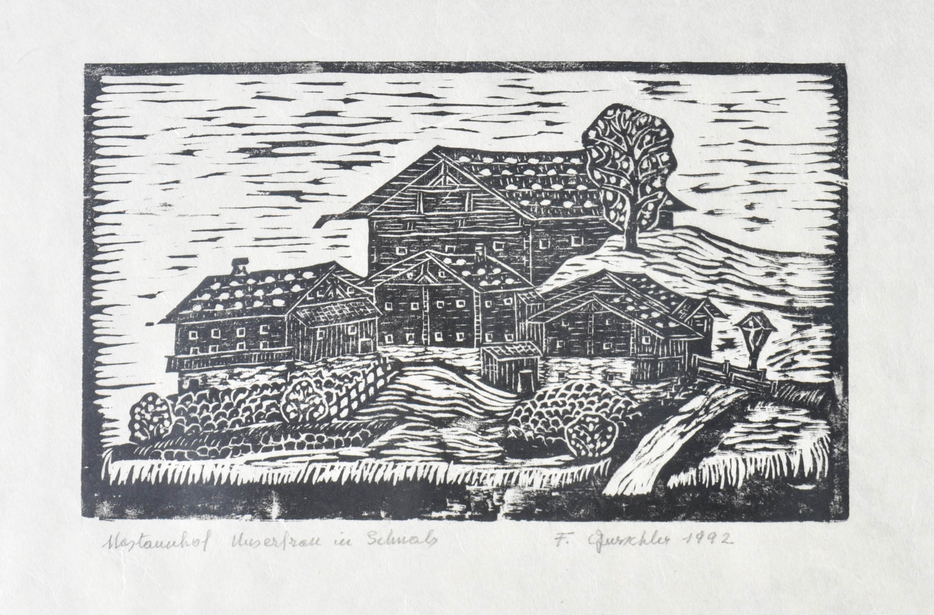 Friedrich Gurschler (Schnals/Senales 1923 – 2020) Maso Mastaunhof a Madonna di Senales, 1992;Xilografia, 34,5 x 46,5 cm (foglio), in cornice