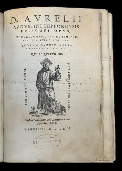 AGOSTINO. Sermones omnes, tum de tempore, tum de sanctis complectens. Venezia. [s.e] 1562. 8vo, vignetta al frontespizio, sottolineature e qualche nota marginale coeva (qualche macchia) Legatura coeva in piena pergamena, titolo manoscritto al taglio. Ex Libris (coevo) Fratris Hieronimi Valvasoriis.