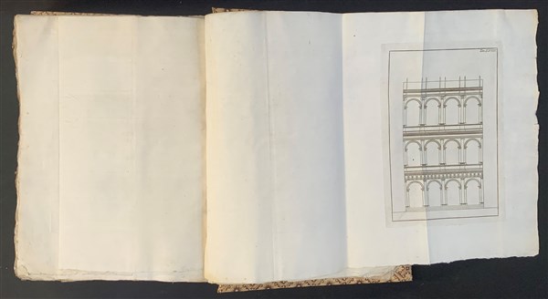ALBERTI Leon Battista. I dieci libri di architettura..tradotti in italiano da Cosimo Bartoli. Roma: nella stamperia di Giovanni Zempel presso Monte Giordano, 1784. 4to, marca tipografica al frontespizio, capilettera xilografici, 35 tavole incise in rame, numerate I-XXXV e ripiegate in fine al volume (frontespizio con mancanze, macchie di umidità, i difetti sono nella prima parte del volume). Carta modena. Collazionato e completo sia per il testo che per le tavole