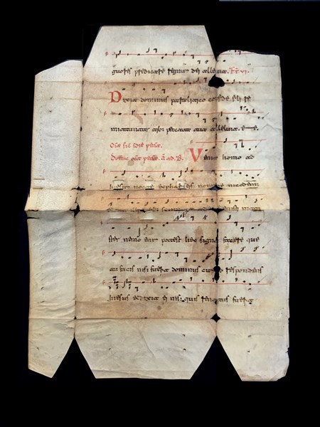 [ANTIFONARIO] Frammento di pagina di antifonario . Italia, fine sec XIII. (420x290 mm) Cinque iniziali in rosso, scrittura beneventana, segnatutura neugmatica su un rigo in rosso. segni di riutilizzo come legatura.