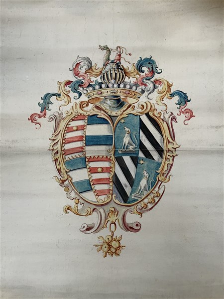 [ARALDICA] Stemma araldico con scudi accollati delle famiglie Dal Verme e Taverna. Milano c.1790. (755x500 mm) Tepera su carta, lievi difetti