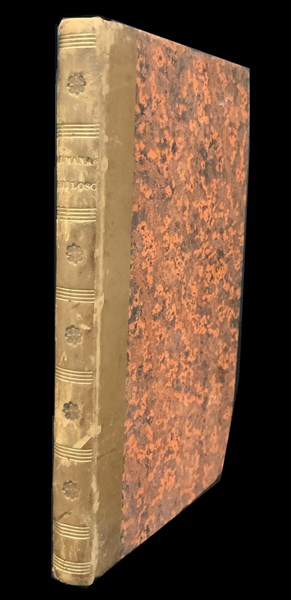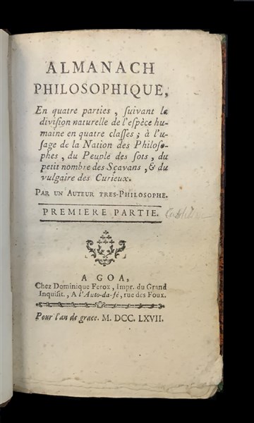 [CASTILHON, Jean-Louis]. Almanach philosophique. Goa: Farox, A l'Auto-da-fe, rue des Foux, 1767. 12mo, legatura coeva con dorso in pelle e titolo in oro. Curioso almanacco scritto da Castilhon, giornalista conosciuto per aver contribuito a numerosi voci storiche del Supplément à l'Encyclopédie.