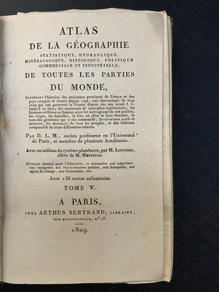 DELAMARCHE. Atlas de la geographie. Parigi: Arthus Bertrand, 1809. Solo tomo V con numerosissime carte geografiche incise in rame e ripiegate, molte colorate a mano nei confini. Dorso in pelle coeva, piatti in cartone marmorizzato. Non collazionato e difetti da esaminare.