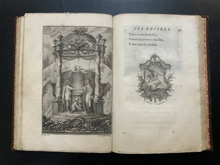 DORAT, Claude Joseph. Les Baisers precedes du mois de mai. L'Aia: Lambert e Delalain, 1770. 8vo, vignetta al frontespizio, secondo frontespizio incisio, una tavola fuori testo e numerose illustrazioni calcografiche nel testo (manca la carta f8, qualche difetto). Legatura del 900 in finta pelle (difetti e mancanze).