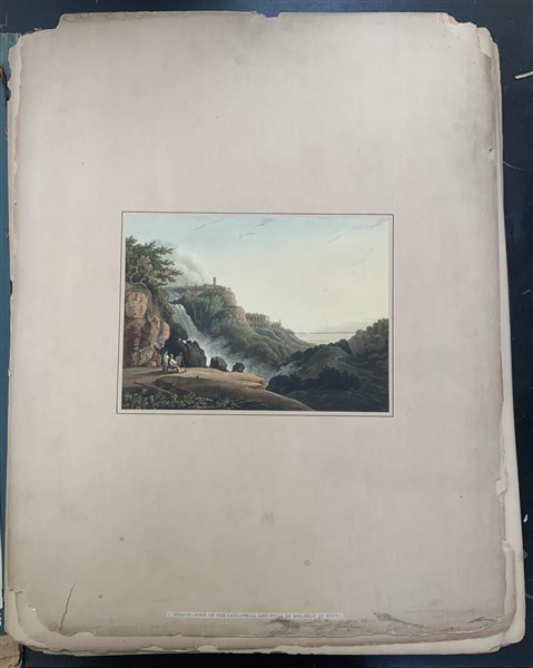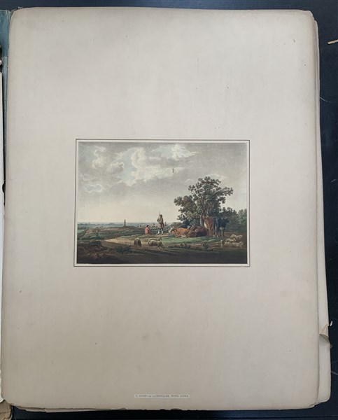 DULWICH GALLERY. Dulwich: R. Cockburn, [s.d. ca. 1830.] 50 acquatine montate su 44 tavole in cartone (mancanze e strappi ai supporti, acquatinte in buone condizioni) preservate in un portfolio dell'epoca (piatto anteriore staccato, gravi difetti). Provenienza: Haverick Public Gallery (timbro ed exlibris). Rara raccolta che illustra la celebrata Dulwich Gallery, la prima galleria pubblica d'Inghilterra, aperta nel 1817. Le acquatinte riproducono dipinti di Claude, Teniers, Rembrandt, Wouvermans, Ruysdael, Cuyp, Poussin e altri artisti.