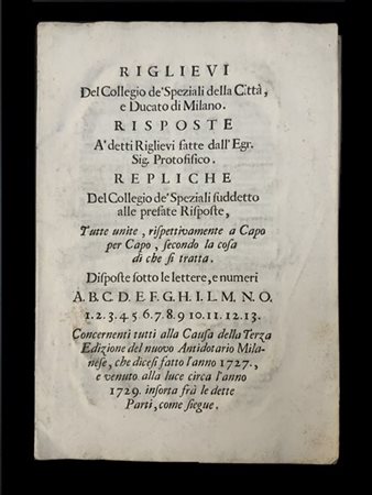 [FARMACOPEA - MILANO COLLEGIO DEGLI SPEZIALI] Riglievi del collegio de' speziali della città e ducato di Milano...concernenti tutti alla causa della terza edizione del nuovo antidotario Milanese. [Milano: Giuseppe Gallo, 1731] 4to, 56 carte (l'ultima bianca). Privo di legatura [CON:] Serie del seguito nella causa pendente tra il venerando collegio de Speziali della città e ducato di Milano con l'Egr. Sig. Protofisico di tutto il dominio Milanese [Milano, s.e, 1731]. Vera e propria "class-action" del collegio degli speziali milanesi contro il protofisico del ducato di Milano, colpevole di aver dato alle stampe una nuova farmacopea e aver obbligato gli speziali ad aderirvi senza aver chiesto il parere dell'ordine. Le Farmacopee non erano infatti dei semplici repertori ma fissavano per legge le composizioni dei vari preparati a cui bisognava strettamente attenersi. Il Collegio pubblicò dunque quest'opera come proposta di correzione alla nuova Pharmacopea.