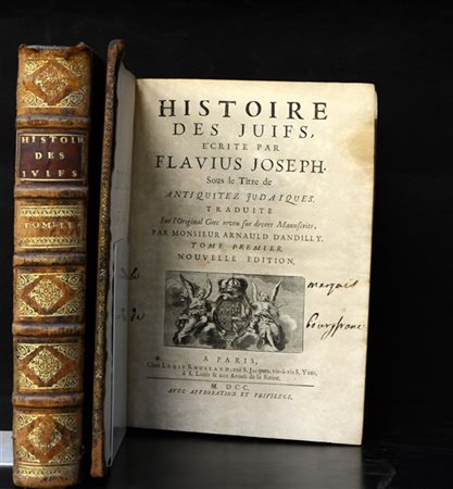 FLAVIO GIUSEPPE. Histoire des Juifs, écrite par Flavius Joseph sous le titre des Antiquités judaïques. Parigi: Louis Roulland, 1700. 4to, 2 voll. Legatura in piena pelle, dorso in oro tagli a spruzzo rossi. Internamente buone condizioni. Non collazionato e difetti da esaminare.