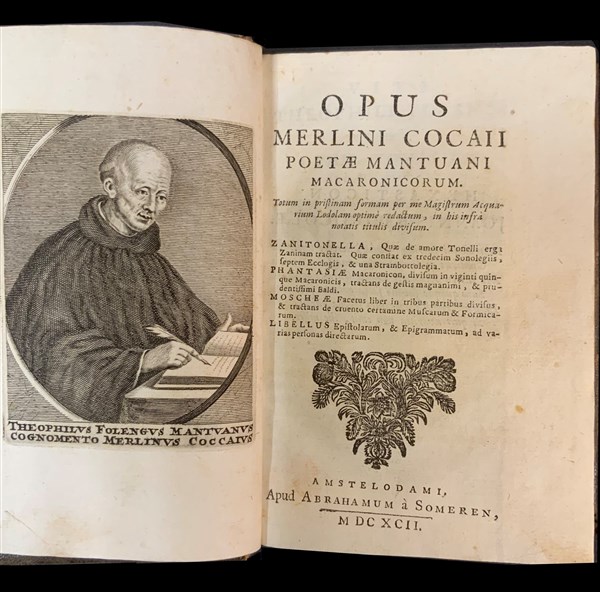 FOLENGO, Teofilo. Opus Merlini Cocaii poetae Mantuani macaronicorum. Amsterdam i.e. [Napoli]: Abramo Someren, 1692. 8vo, ritratto inciso in antiporta, numerose incisioni nel testo, molto fresche. Buona copia in pelle posteriore. Non collazionato e difetti da esaminare.
