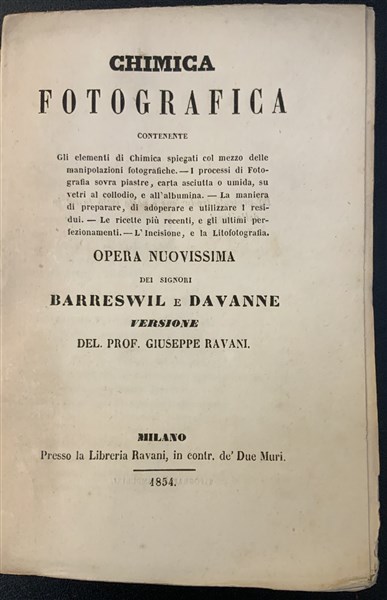 [FOTOGRAFIA] - BARRESWIL Alphonse; DAVANNE Louis. Chimica Fotografica. Milano: Ravani, 1854. 8vo, privo di legatura (parzialmente slegato) Rara prima edizione italiana di questo trattato di chimica fotografica pubblicato a Parigi nello stesso anno. Non collazionato e difetti da esaminare.