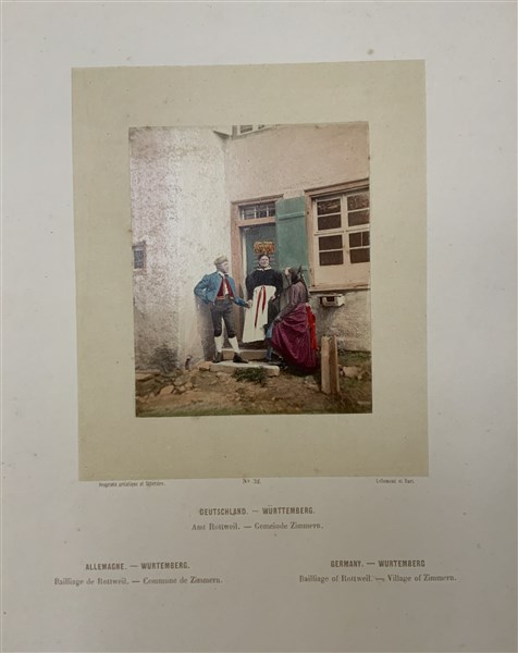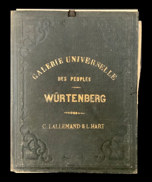 [FOTOGRAFIA] Galerie Universelle des Peuples, Wurtemberg. Lallemand and Hart. Strasburgo: 1865-70. Un volume in 4to in brossura + 17 vedute all'albumina colorate applicate su cartone editoriale; il tutto entro protfolio editoriale in percallina con titolo in oro al piatto (difetti). Rara raccolta di fotografie all'albumina dedicate ai costumi popolari del Wurtemberg