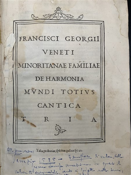GIORGIO, Francesco. De harmonia mundi totius cantica tria. Venezia. Bernardino Vitali, 1525. Folio, frontespizio entro cornice xilografica, numerose illustrazioni nel testo. Manca la carta p6 e il fasciolo r1-6 (Note moderne in penna al frontespizio, Gora d'umido al margine superiore esterno a partire dalla carta R3 fino alla fine del volume, lieve foro di tarlo dalla carta S alla carta b4, qualche macchia e ripari) Legatura del XVI secolo con dorso in pergamena (difetti, segni di tarlo) Copia, purtroppo scompleta, di questo interessante trattato teologico cristiano in cui l'autore in mescola agostinismo, origenismo, scotismo e la Qabbalah di cui Giorgio era un grande conoscitore.