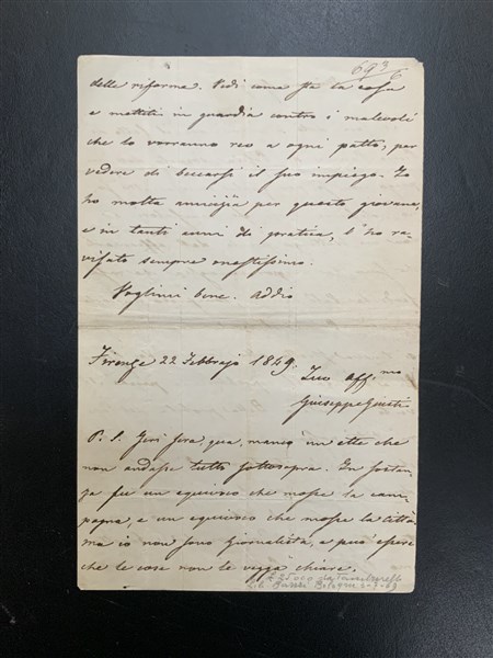 GIUSTI, Giuseppe. Lettera autografa datata 22 Febbraio 1849.