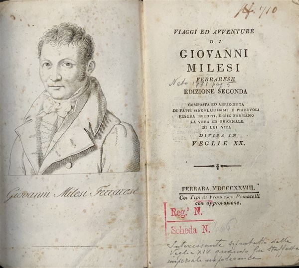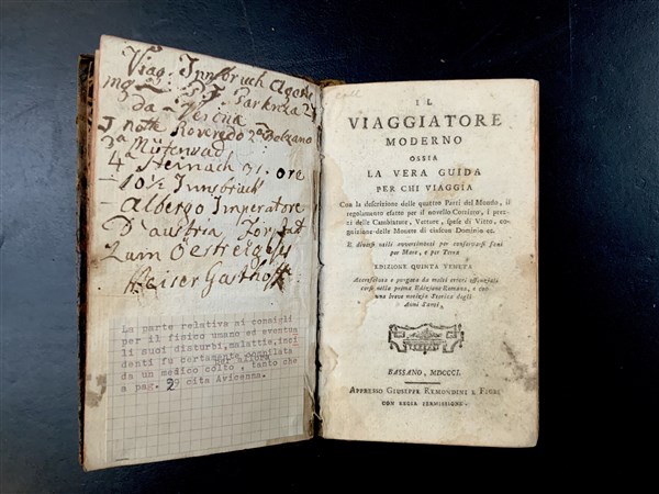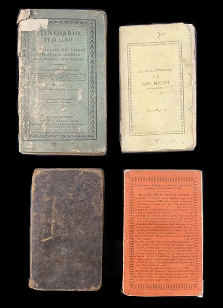 [GUIDE] Lotto di guide: VALLARDI, Pietro. Itinerario italiano ossia Descrizione dei viaggi per le strade più frequentate alle principali città d'Italia. Milano: Vallardi, 1816. 8vo, 16 (su 17) carte geografiche ripiegate (qualche macchia e fioriture) Brossura editoriale stampata (legatura debole, mancante il dorso e il piatto al retro) [CON:] AMORETTI Carlo. Viaggio da Milano ai tre laghi. Milano: Silvestri, 1824. 12mo, ritrato dell'autore in antiporta. Brossura editoriale coeva (lievi difetti) [E:]Il Viaggiatore moderno: Bassano:Remondini, 1801. 12mo, legatura coeva in piena pelle (difetti) [E:] Viaggi ed avventure di Giovanni milesi. Ferrara: Pomatelli: 1828. 8vo, ritratto dell'autore in antiporta, brossura editoriale coeva. Non collazionato e difetti da esaminare.
