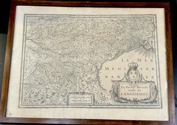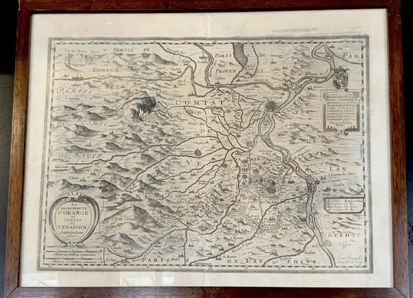 HONDIUS, Jodocus e Henricus. Coppia di carte geografiche del secolo XVII (485 x 559mm la misura delle cornici). La prima mostra "La partie meridionale du Languedoc" e la seconda "La principauté d'Orange et comtat de Venaissin. Amsterdam 1627" (lievi difetti)