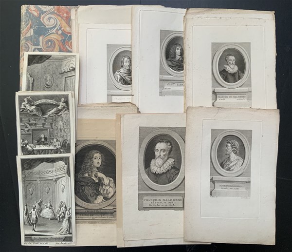 [ILLUSTRATI] Raccolta di diversi ritratti incisi del '700, principalmente letterati e regnanti francesi, sciolti entro elegante brossura in carta marmorizzata. Nel lotto anche 5 tavole disegnate e incise da Novelli e Baratti