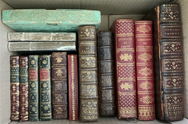 [LEGATURE] lotto composto da volumi religiosi del secolo XVIII e XIX in belle legature in marocchino. Tra questi si segnalano: ROY. L’ami des Veillards, Parigi: Imprimerie de monsieur, 1784. 16o, 2 vol. Legatura in marocchino rosso con titolo e decori in oro al dorso, tagli dorati e sguardie marmotizzate. [E:] Almanach dedié aux dames pour l’année 1829. Parigi: Delaunay, 1828. In 16o, legatura in marocchino rosso con decorazioni in oro ai piatti e fregi in oro al dorso. In elegante cofanetto anch’esso in marocchino rosso che imita i fregi della legatura. Non collazionato e difetti da esaminare.